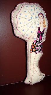 É, como os outros, de Pano Crú, recheada a bolinhas de esferovite e bordada a Ponto de Cadeia, Ponto Atrás e Ponto de Cetim em linha de algodão, os tecidos são apostos em Ponto de Festão separado que também é usado para o debrum. A única diferença é a inclusão de lantejoulas e o relevo (receio que na foto não se note!) das maminhas, que são contas de madeira.