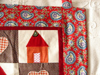 os Blocos foram feitos a partir destas casinhas e de corações aplicados a Ponto de Festão separado com linha de algodão n.º12, com tecidos 100% algodão; os blocos são cosidos alternadamente e envoltos em "caixa" fina em bordeaux, rodeada por faixa larga em algodão africano. Tem quatro olhais em tecido para pendurar.